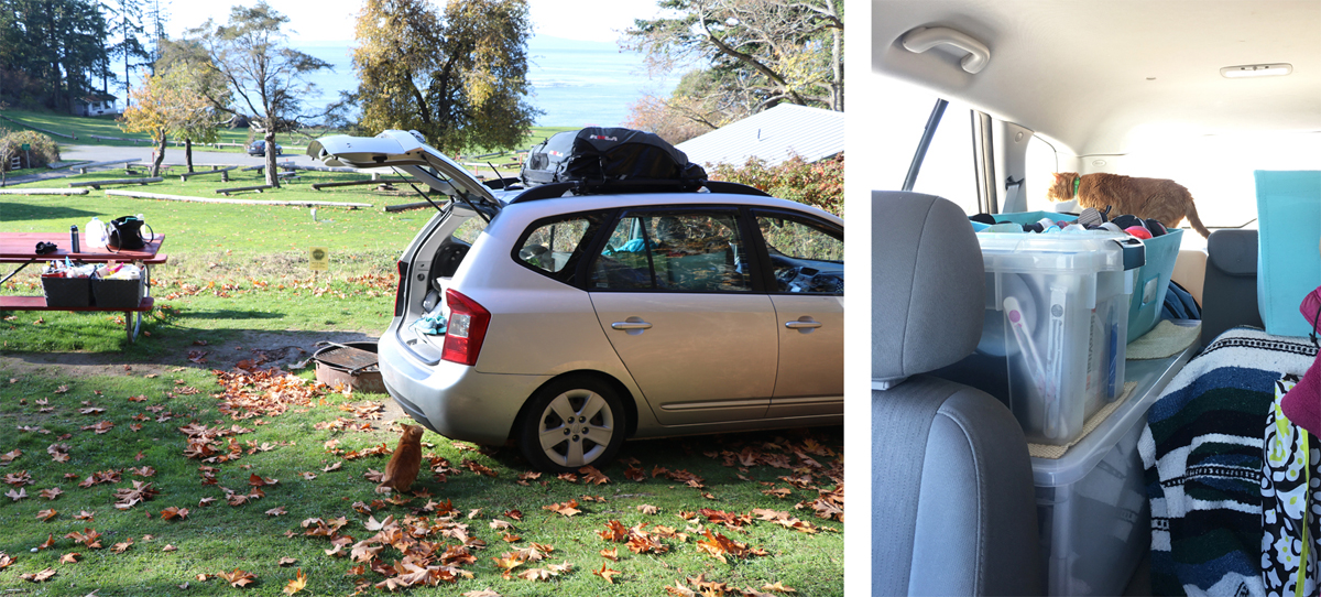 I loaded my tiny Kia Rondo car with a mobile office, filming and camping supplies, two small suitcases of clothes, a crate of shoes, a food cooler, four gallons of water and a giant cat litter box. The packing was complete with cat toys, cat food and one terrifically terrified cat.