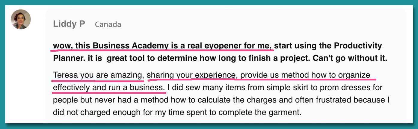 - Post your homework in our safe, private Facebook group and leave comments on other sewists' posts using your new business knowledge.