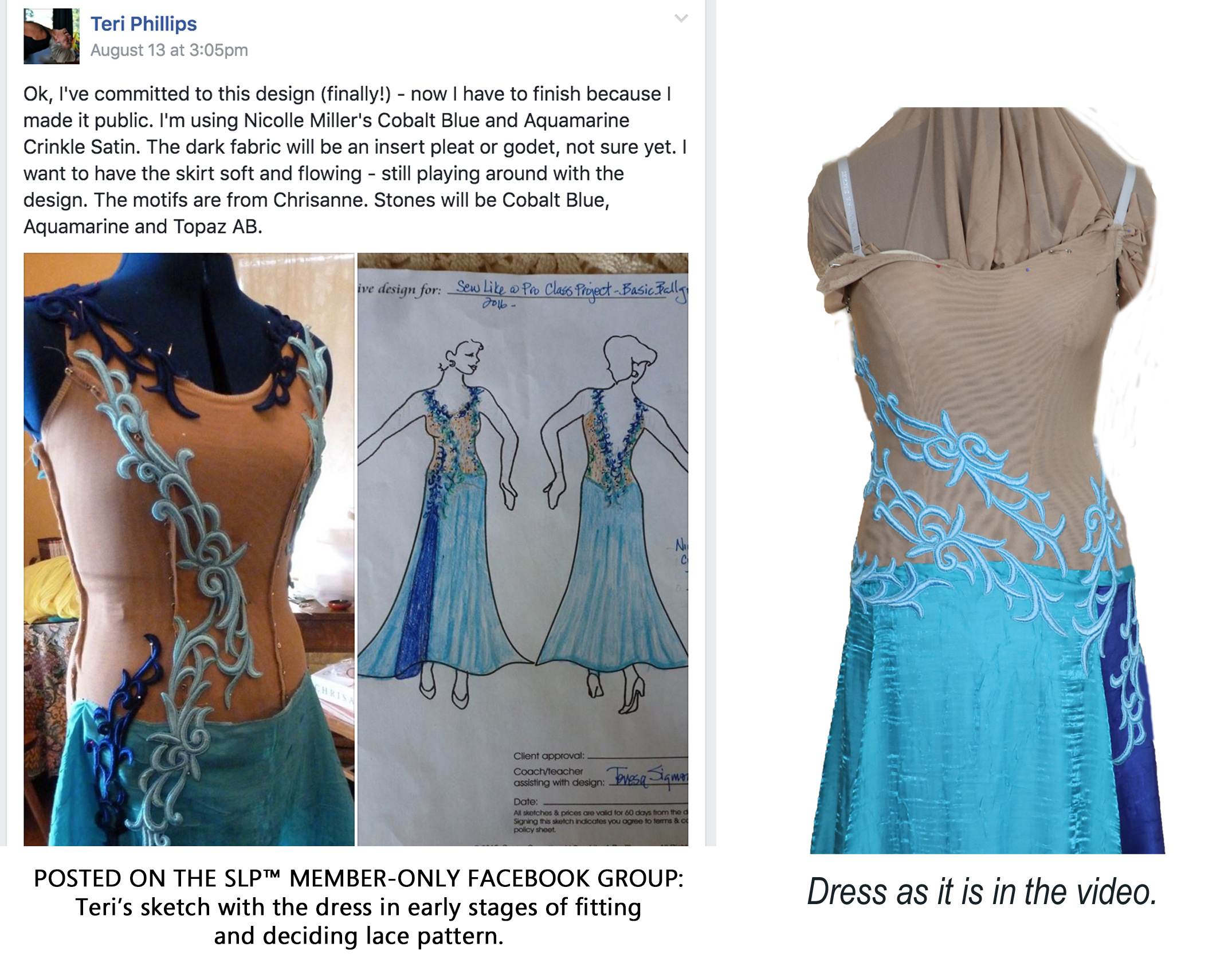 On the left is Teri’s original sketch and first fitting of the leotard with the lace pinned on according to her design. She posted this on our member-only Facebook group early in the dressmaking process.