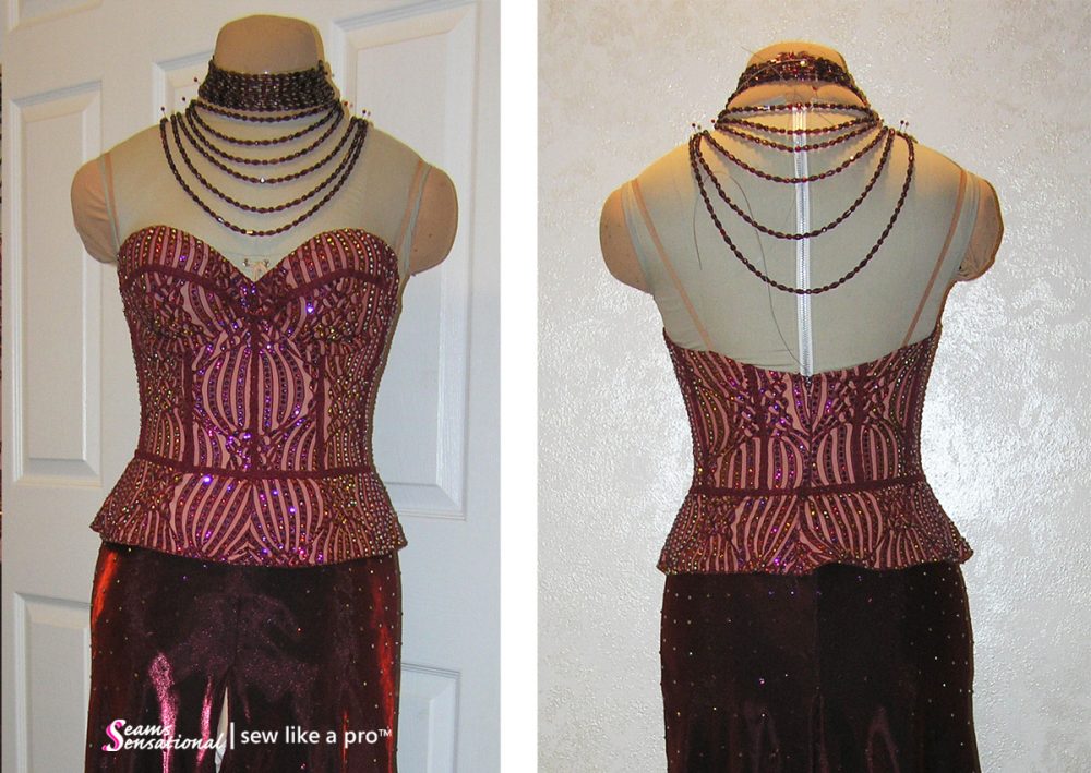 tags: corset, bra, bias tape, measuring, stride length, leotard pattern, keyhole back, back dart, collar, cap sleeve, skirt fabrics, non-stretch underskirt, velvet, velvet pressing board, needle board, overdress, 3-D jewels, simple skirt patterns