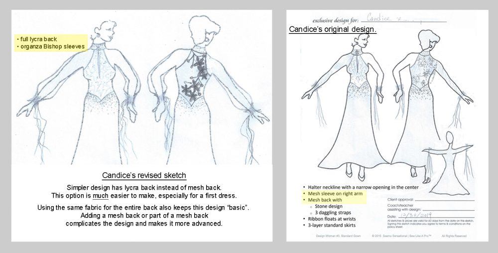 T's answer DESIGNING FOR "BASIC" OR "ADVANCED":  The revised design will be much easier to make than the first.  The simpler, revised sketch will save you hours of time, especially since this is your first dress.