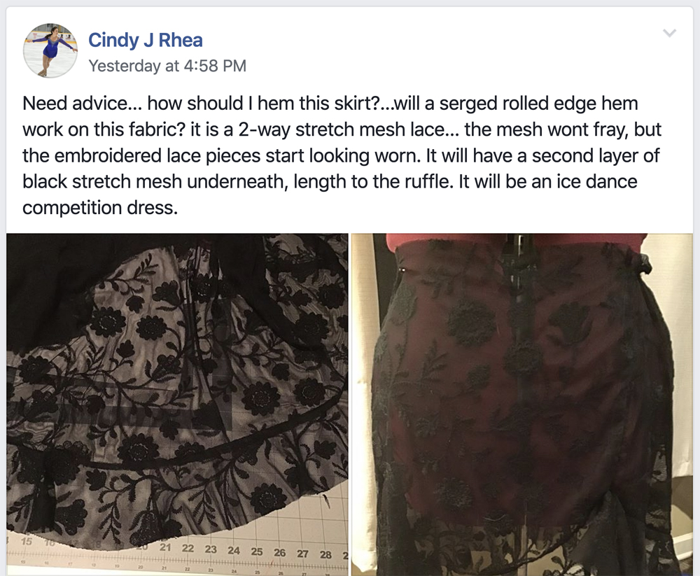 Cindy's Q:  I'm making a skirt for an ice dance dress with a two-way stretch lace ruffle, and I wasn't sure how to hem the ruffle.  The embroidered lace gets worn-looking pretty quick.  The ruffle is only about 2 or 3 inches wide. Should I do a rolled edge hem? (1:03:30-1:10:00)