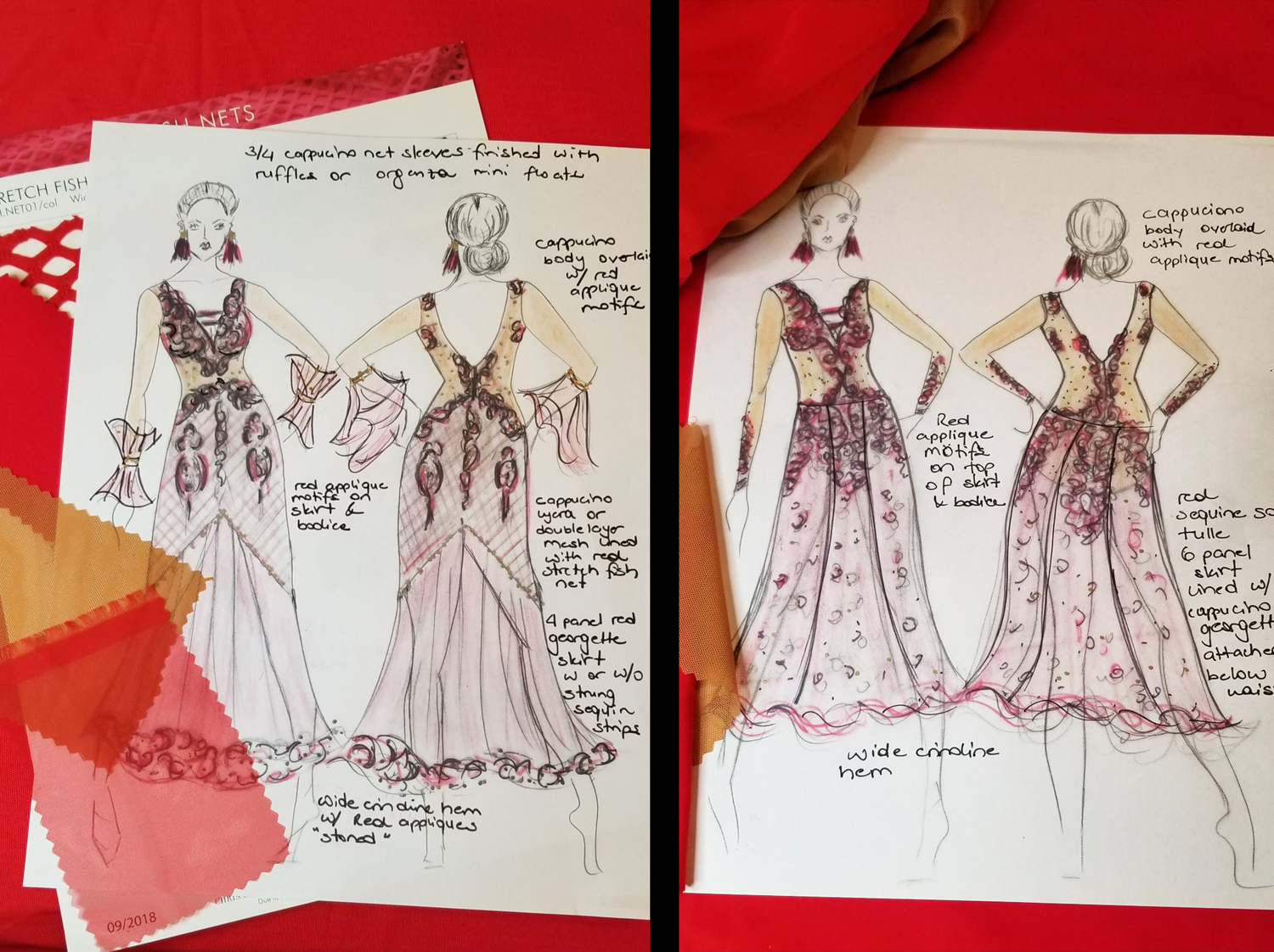 Elif’s Q #1:  I I have two sketches for a tango show dress.  The bodices for these sketches are the same.  Both sketches have a Cappuccino (flesh tone) lycra bodice with red motifs and Cappuccino stretch net or lycra sleeves with red motifs.  I have not decided whether I want to do lycra or mesh for the sleeves.  The mesh on my aqua dress, with all the fittings I was doing, gave me a bad skin rash.  I hope the lycra might be better for my skin. (5:30-24:25).