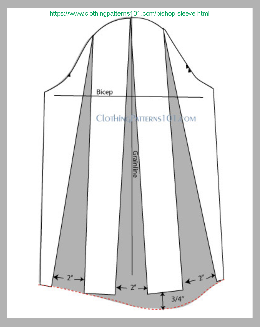T's answer BISHOP SLEEVE:  I pulled this bishop sleeve pattern off the Internet, which is basically like adding godets to a regular sleeve pattern.  I recommend first making a sleeve out of scrap fabric, because you might need to alter the pattern to include more volume. You do not need to include the extra curve to go over the elbow.  Also, decide whether you want a cuff or not with your bishop sleeve.  You could do a rhinestoned cuff, or you could simply gather it at the bottom with elastic.