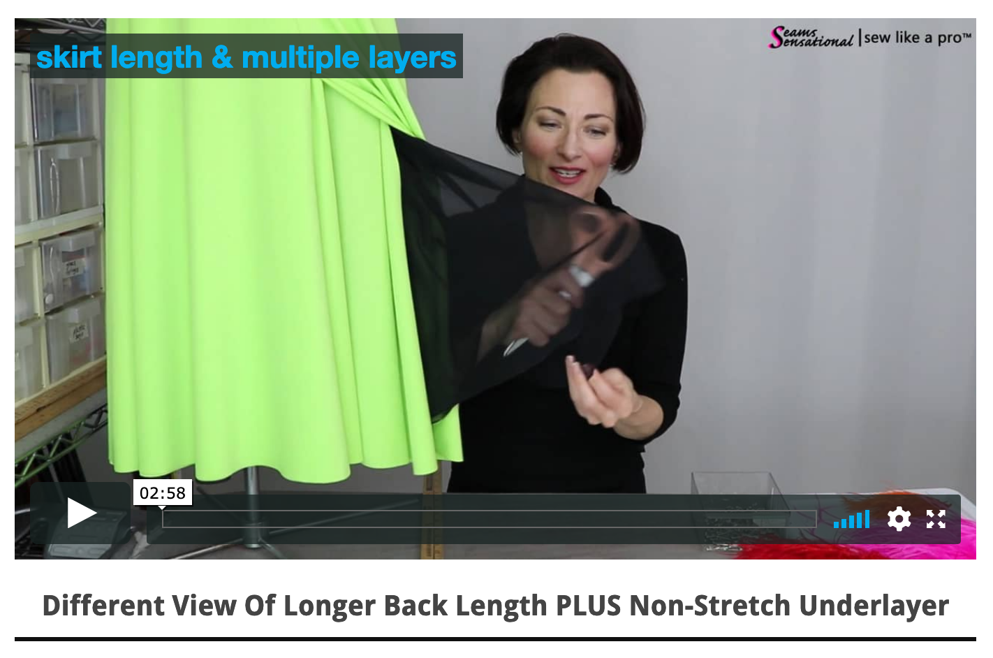 NOTE NOT MENTIONED IN THE LIVE Q&A:  Watch this video that further explains how a longer underlayer can help prevent getting your heel caught in a stretchy top layer.  You’ll find it in the BALLGOWN SKIRTS: TRIM & HEM page.