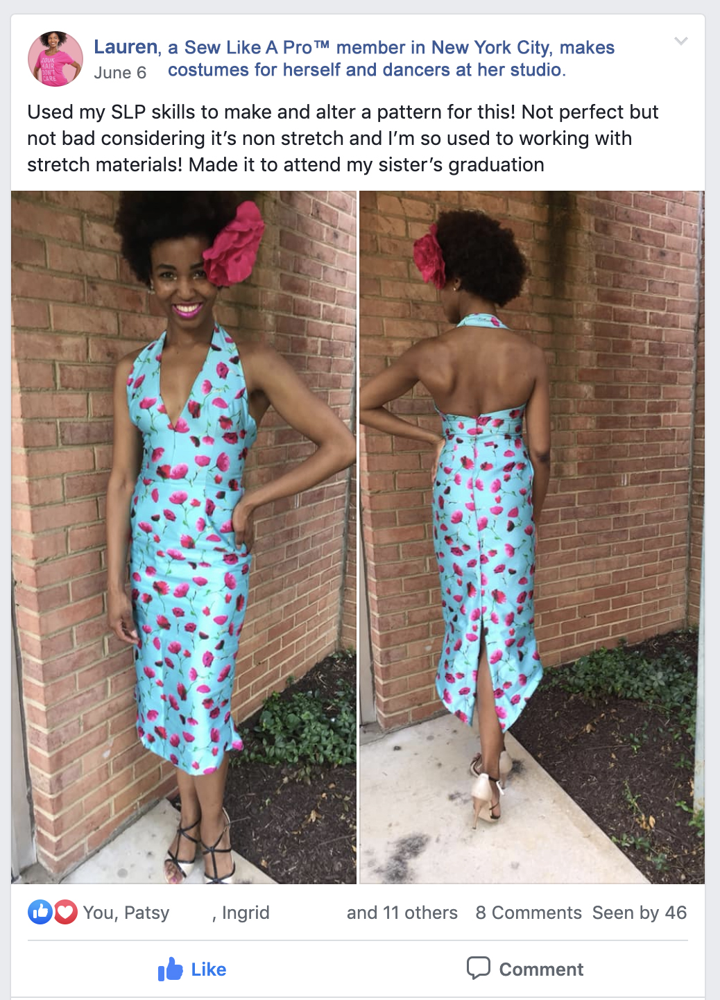 But now, SLP™ members like Lauren have the skills and confidence to make her own custom formal dress patterns whenever she needs a “regular” dress or a competition dance costume.